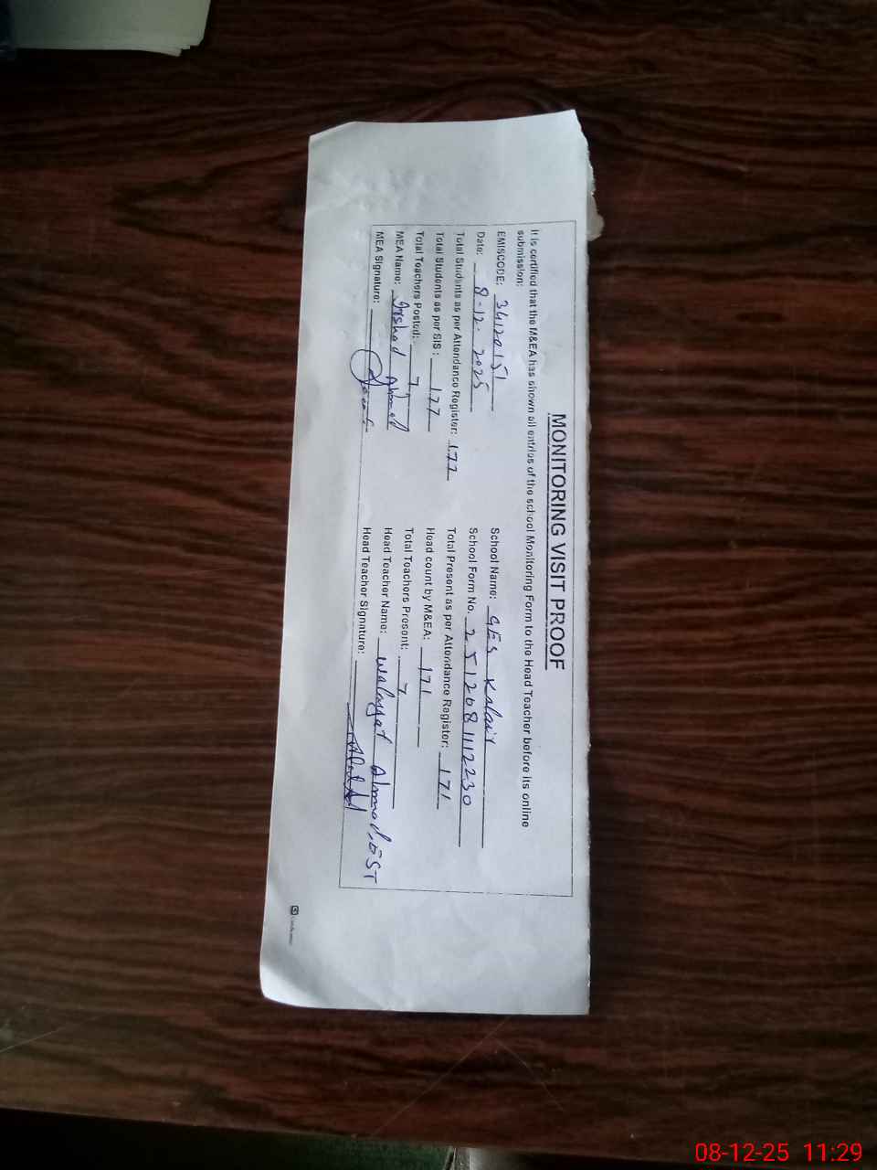 | Attendance Register | Head Teacher | MEA with School | Visit Proof |