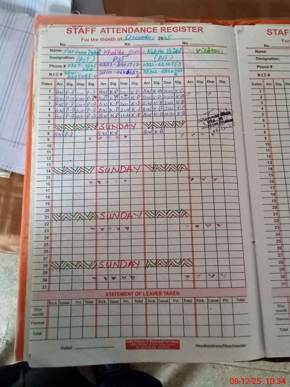 | CNIC | Full Name | Designation | R/C | Absence During Last Calender Month |