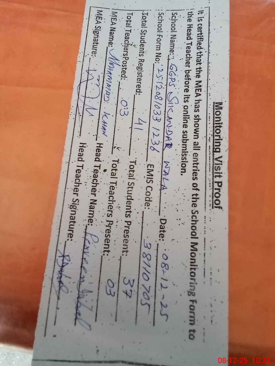 | Attendance Register | Head Teacher | MEA with School | Visit Proof |
