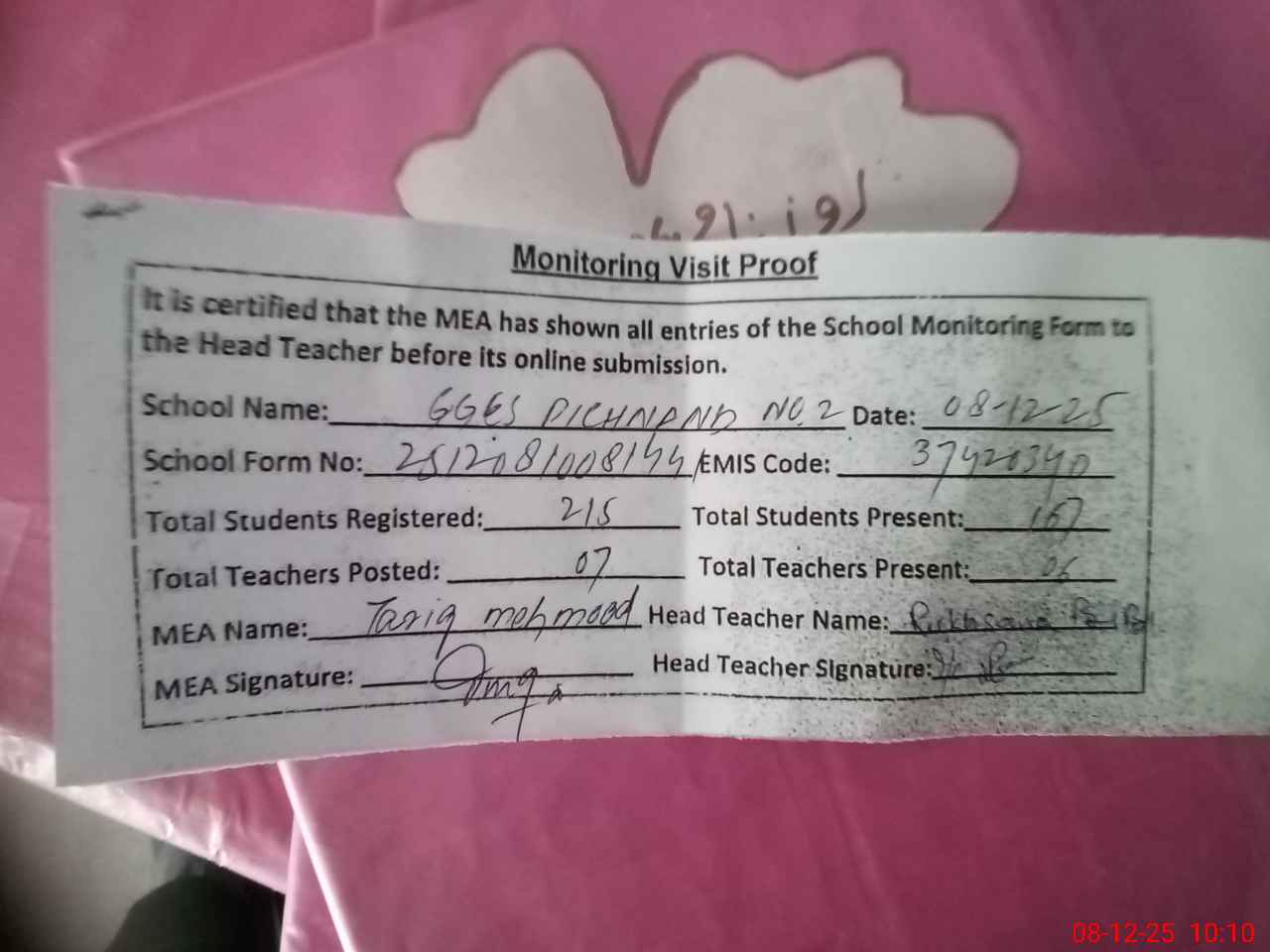 | Attendance Register | Head Teacher | MEA with School | Visit Proof |