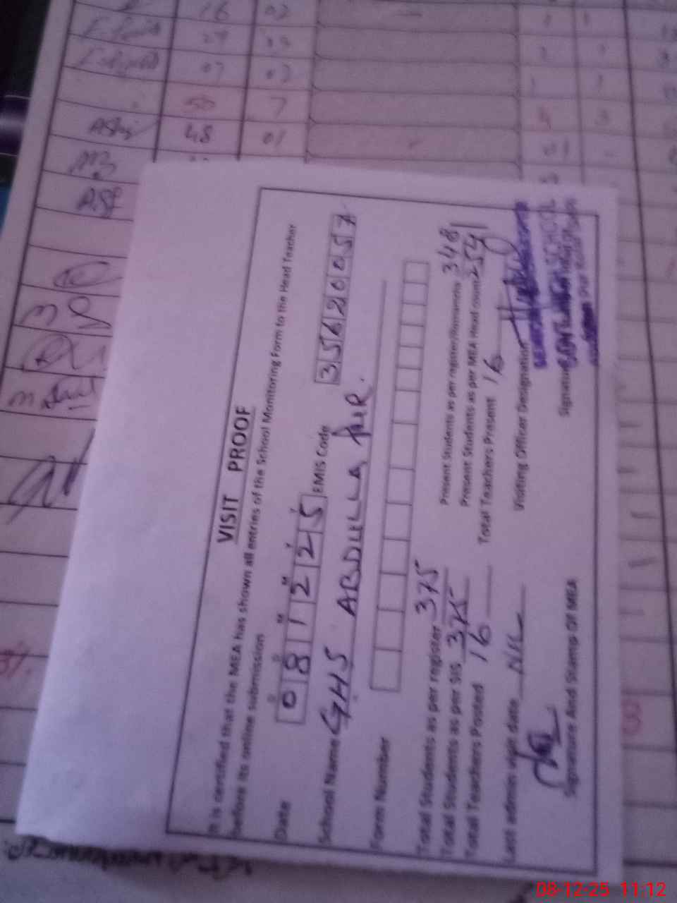 | Attendance Register | Head Teacher | MEA with School | Visit Proof |
