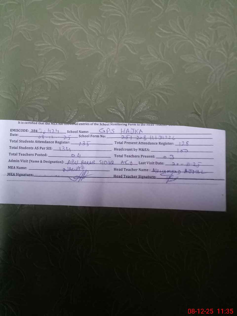 | Attendance Register | Head Teacher | MEA with School | Visit Proof |