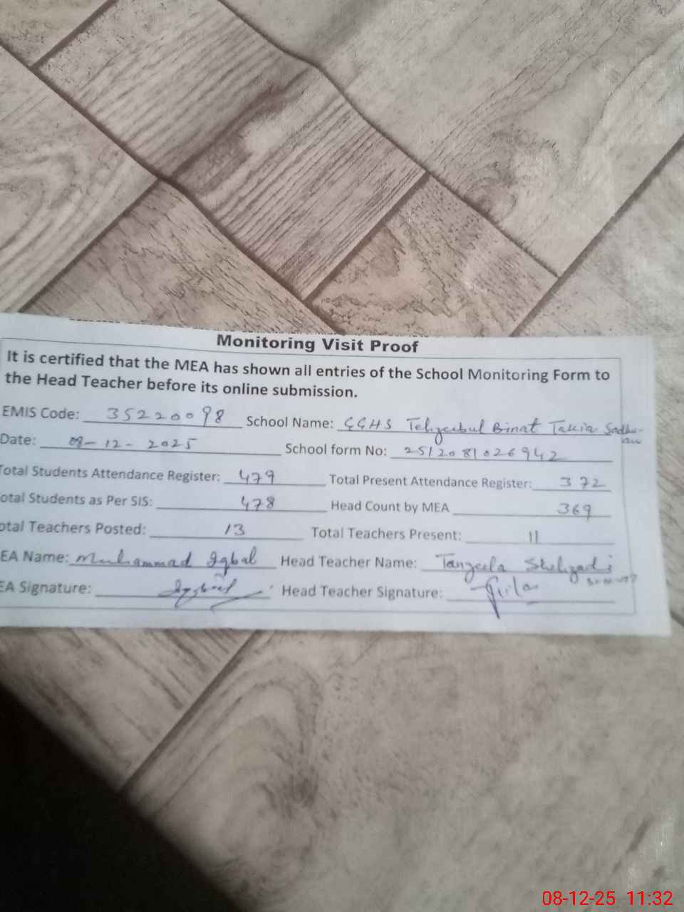 | EMIS Code: 35220098 | Name of School: GGHS TEHZEEB-UL-BINAT TAKIA SADHUAN LAHORE | |||