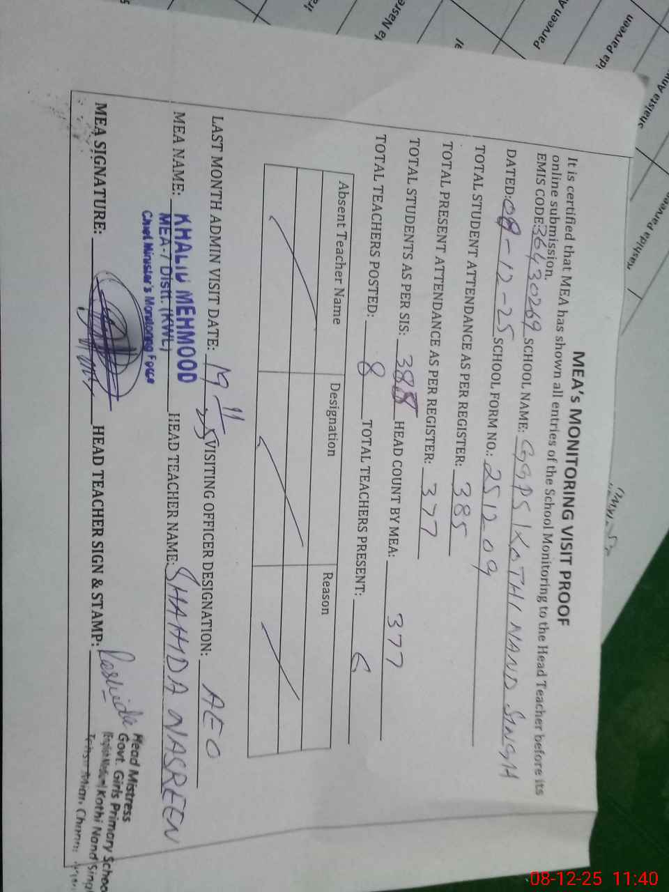 | Attendance Register | Head Teacher | MEA with School | Visit Proof |
