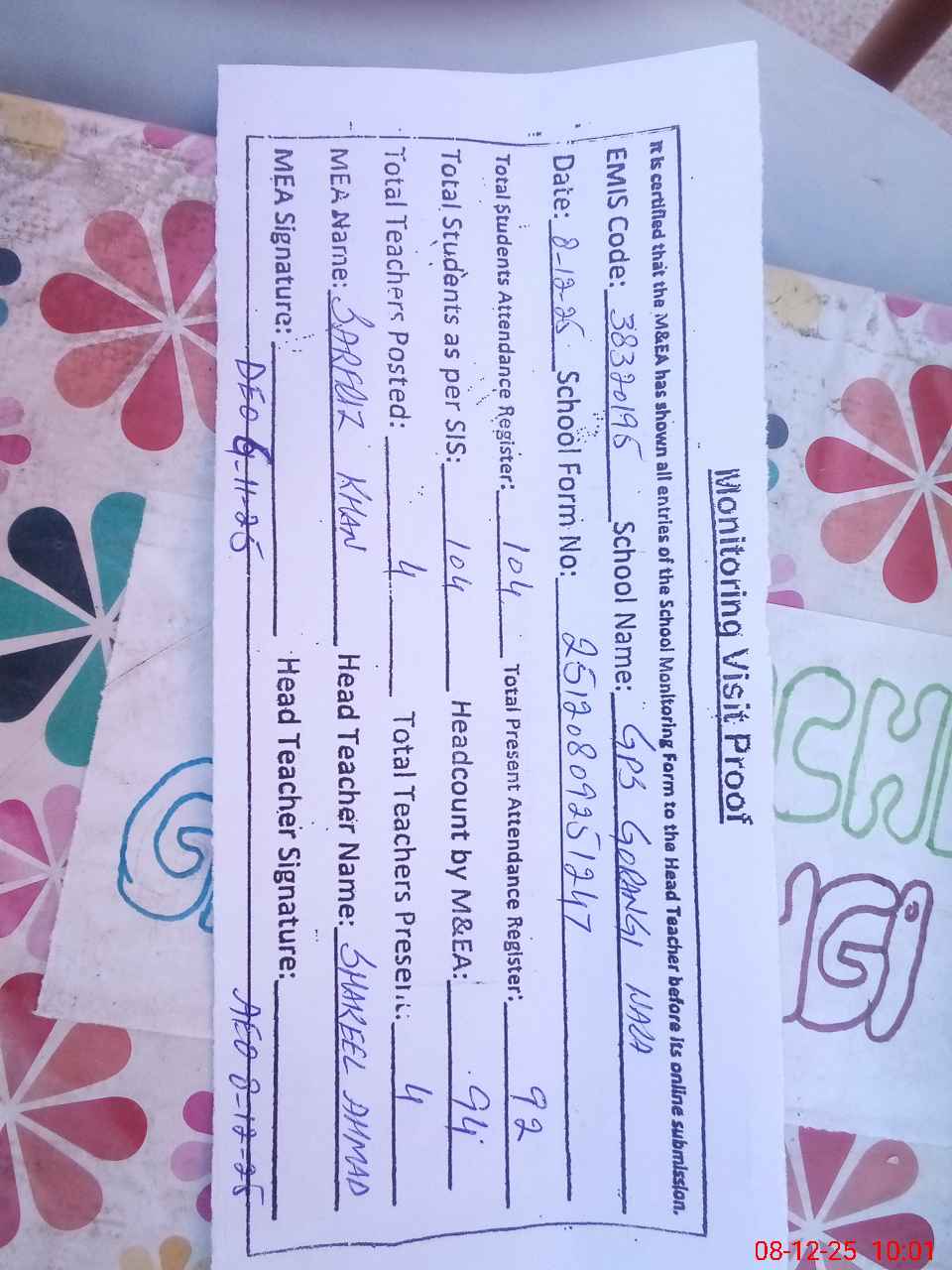 | Attendance Register | Head Teacher | MEA with School | Visit Proof |
