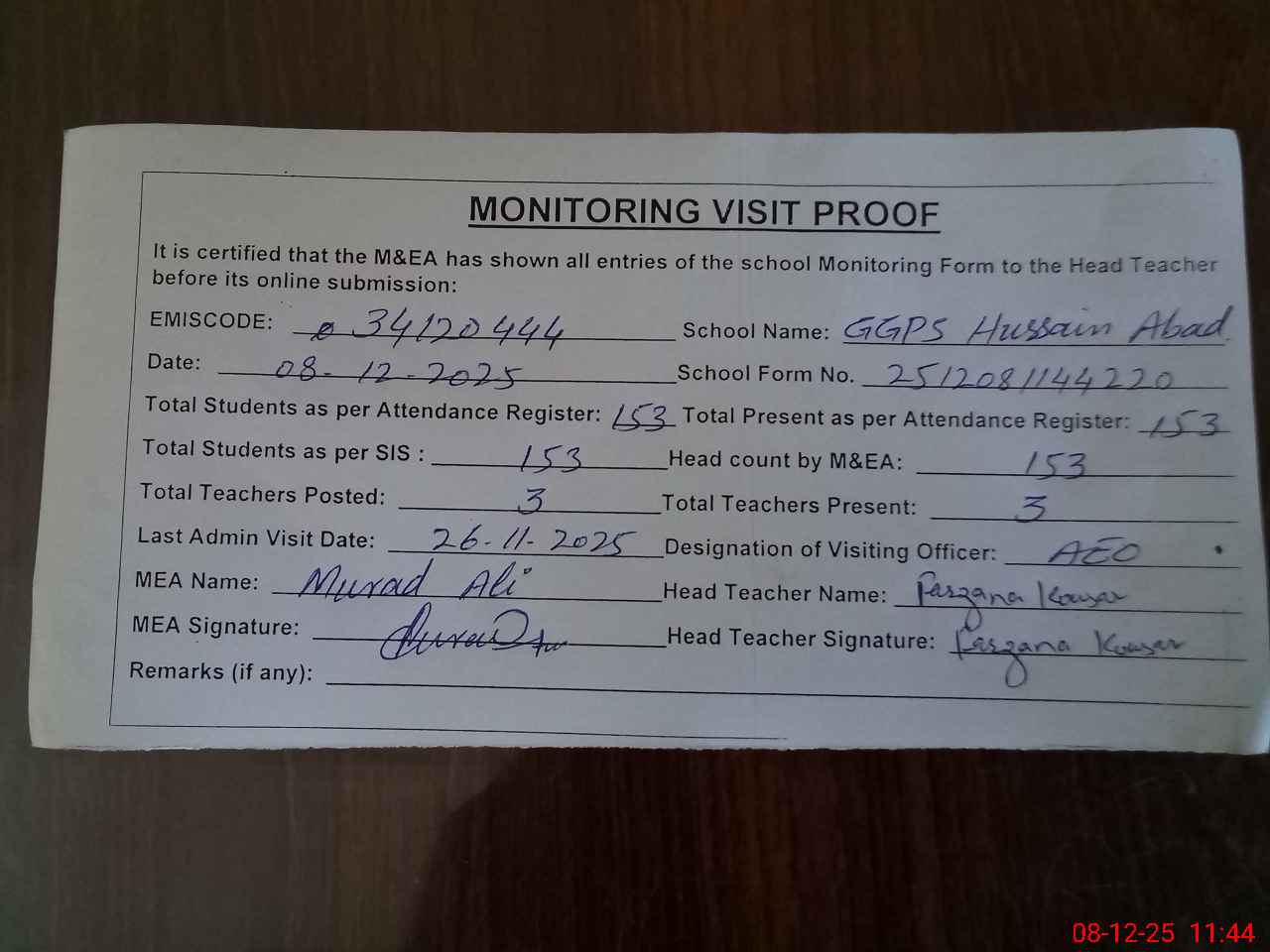 | Attendance Register | Head Teacher | MEA with School | Visit Proof |