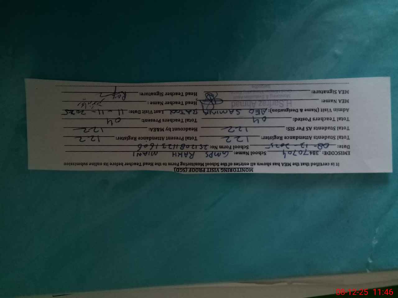 | Attendance Register | Head Teacher | MEA with School | Visit Proof |