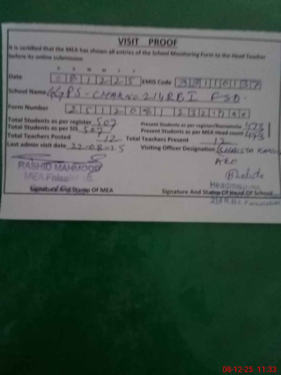 | Attendance Register | Head Teacher | MEA with School | Visit Proof |
