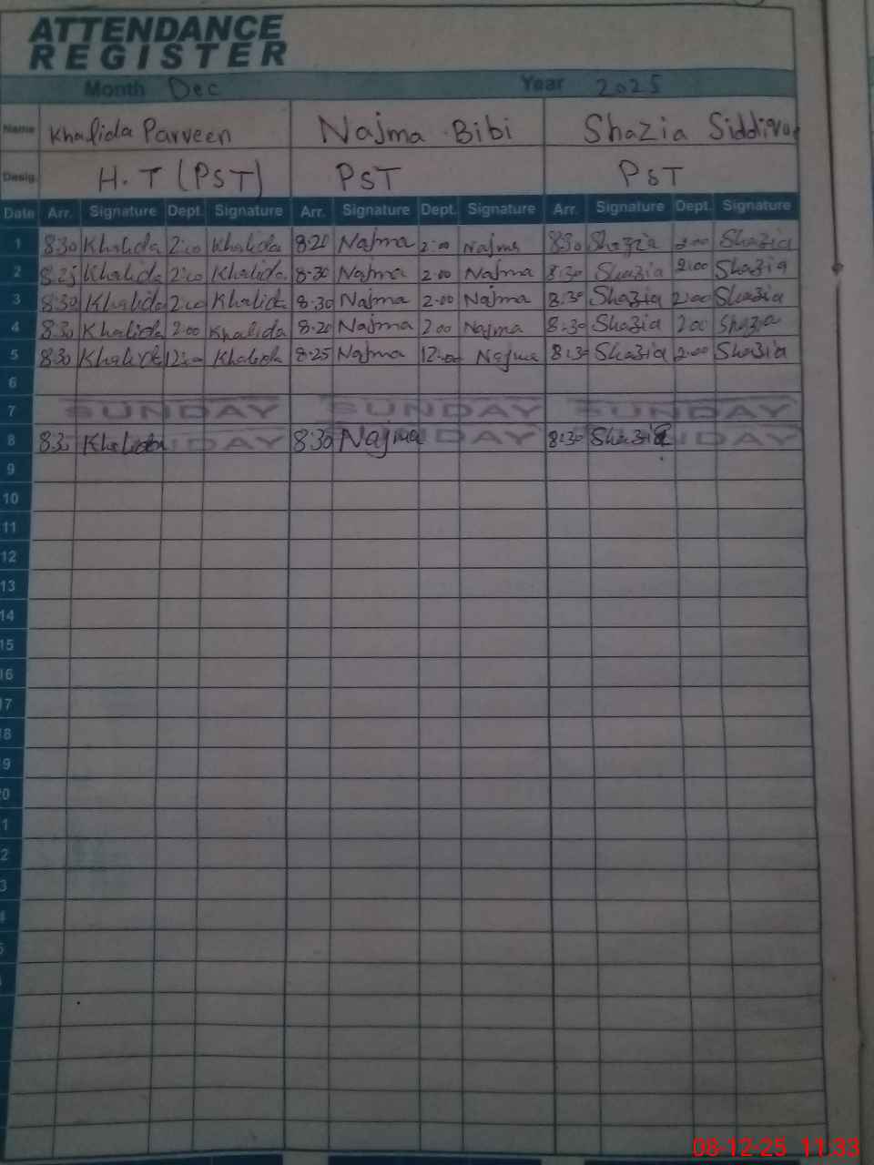| CNIC | Full Name | Designation | R/C | Absence During Last Calender Month |