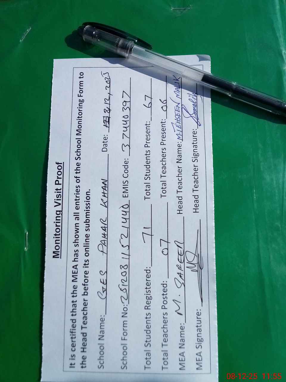 | Attendance Register | Head Teacher | MEA with School | Visit Proof |