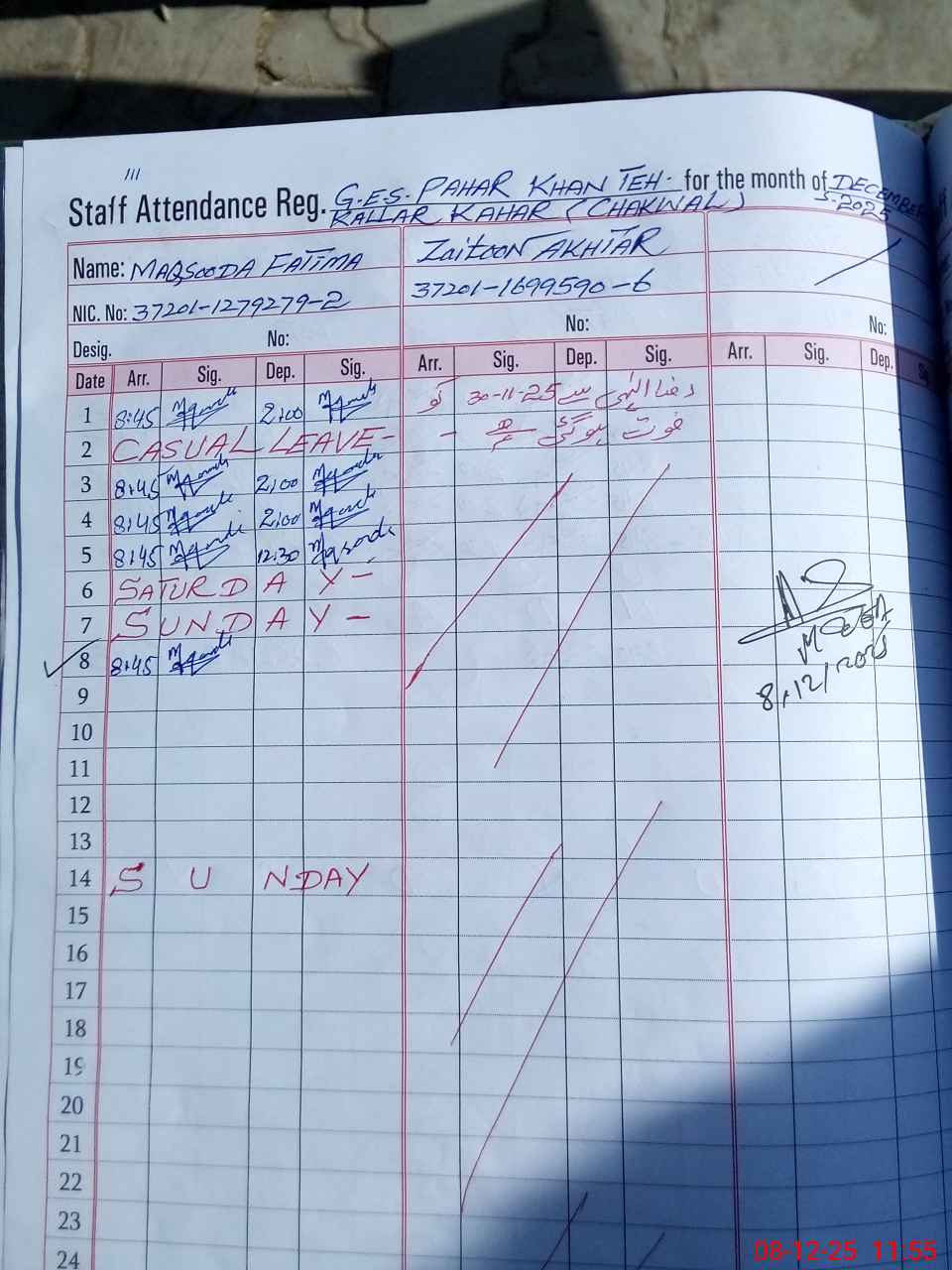 | CNIC | Full Name | Designation | R/C | Absence during last cal. month |