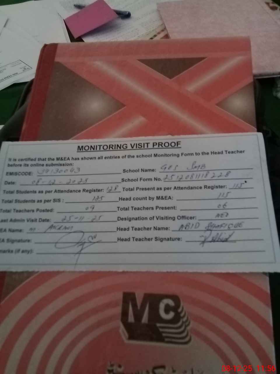 | Attendance Register | Head Teacher | MEA with School | Visit Proof |
