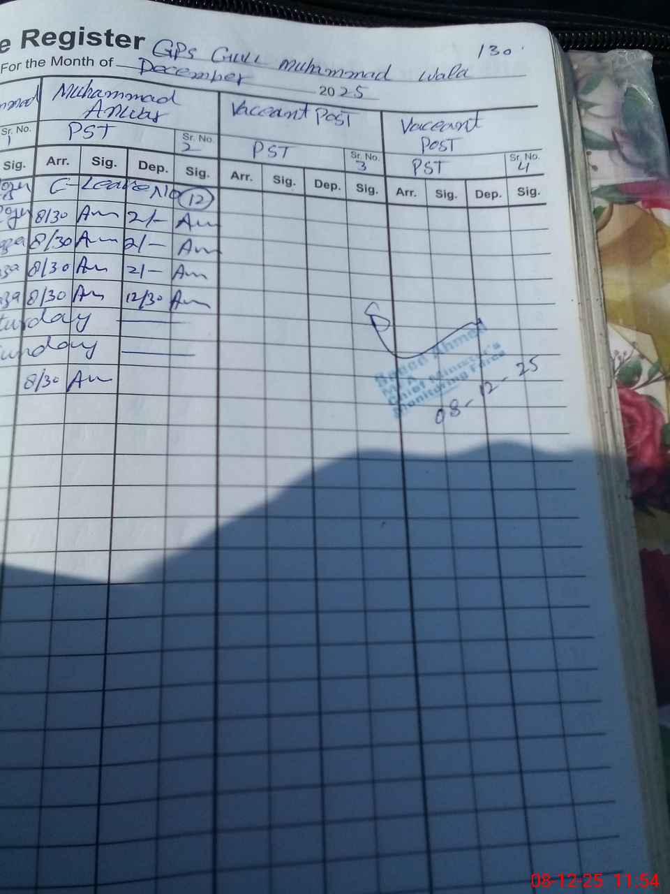 | CNIC | Full Name | Designation | R/C | Absence during last cal. month |