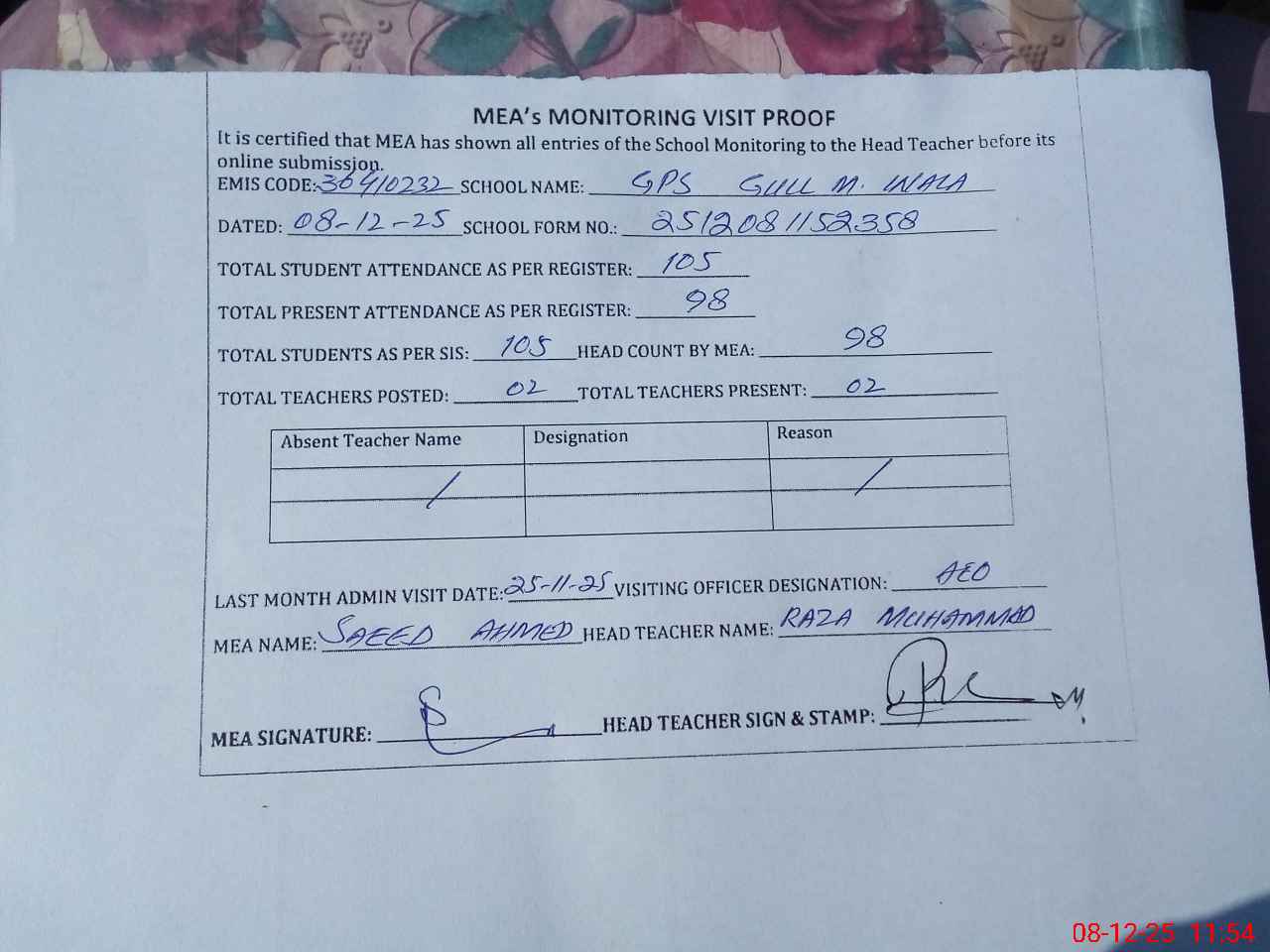 | Attendance Register | Head Teacher | MEA with School | Visit Proof |