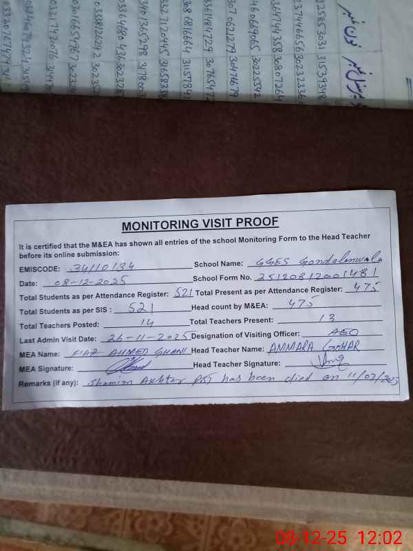 | Remarks (Use Separate Page if Required): Attendance of teaching staff and students on SIS Software is not updated Shamim Akhtar PST has been died on 11 July 2025 Data as per provided by School Staff and found during physical visit | |||||