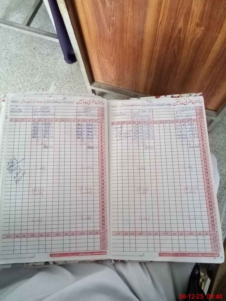 | Total no. of Classrooms: 6 No. of Classrooms Used for Teaching: 4 No. of Classrooms Storing Old Furniture, FTBs, etc: 0Comments if Any: Last visit of AEO Fakhra Hussain on 19 November 2025 and NSB and FTF record not maintain |