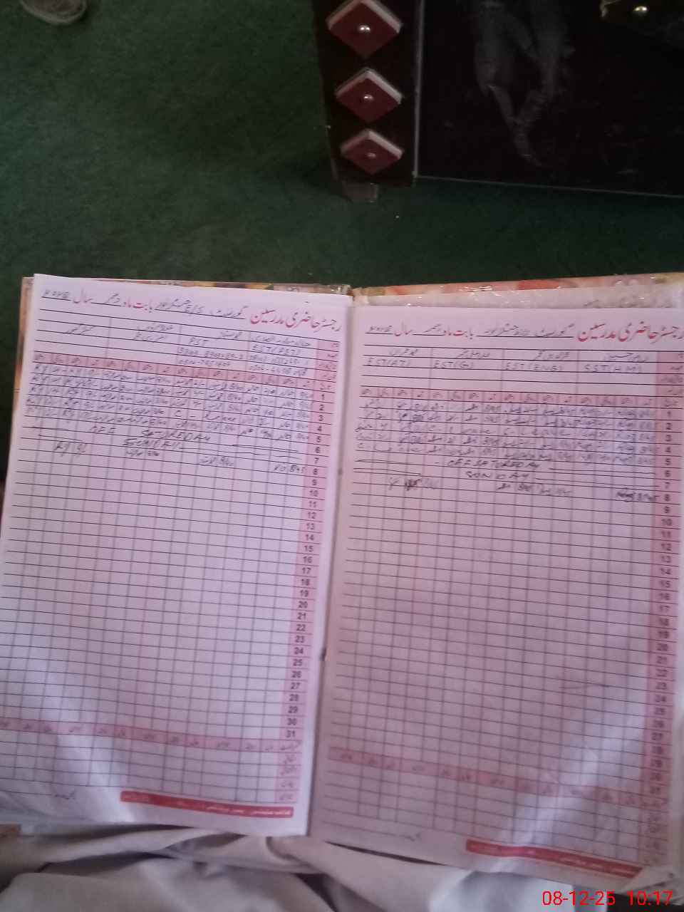 | Total no. of Classrooms: 7 No. of Classrooms Used for Teaching: 5 No. of Classrooms Storing Old Furniture, FTBs, etc: 0Comments if Any: Last visit of AEO Tahir Iqbal on 19 November 2025 and NSB and FTF record not maintain |