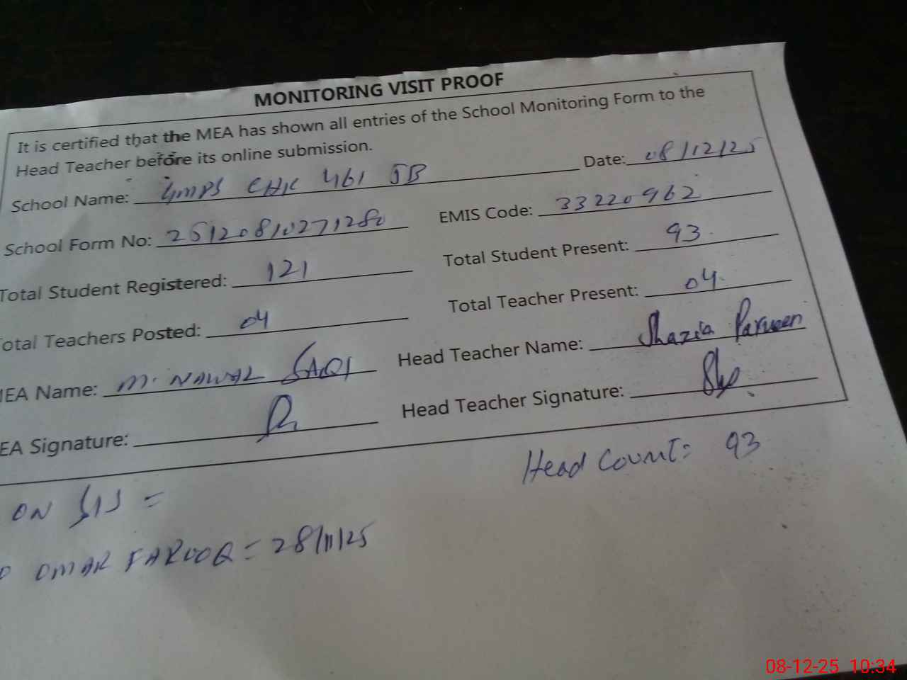 | Attendance Register | Head Teacher | MEA with School | Visit Proof |