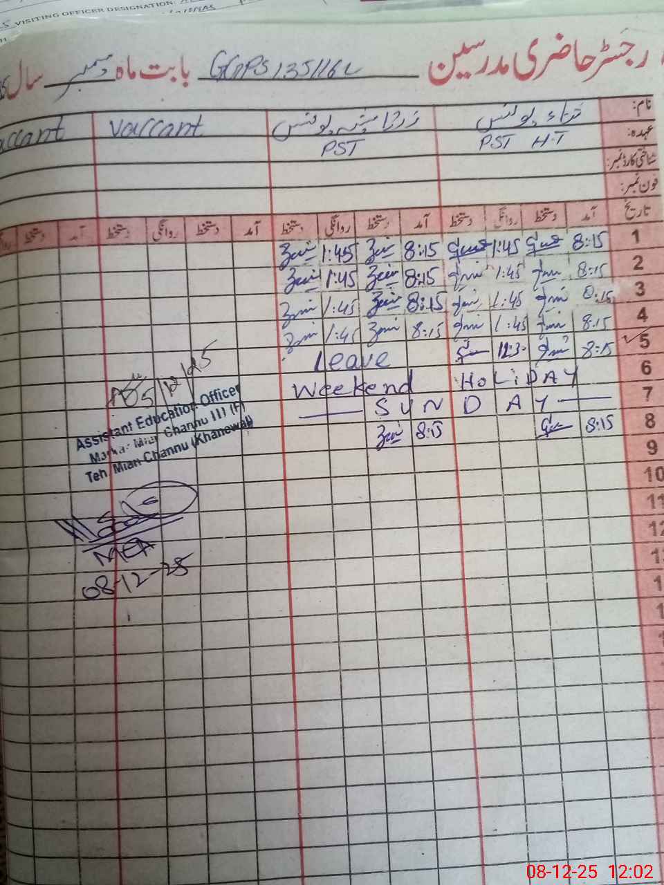 | CNIC | Full Name | Designation | R/C | Absence During Last Calender Month |