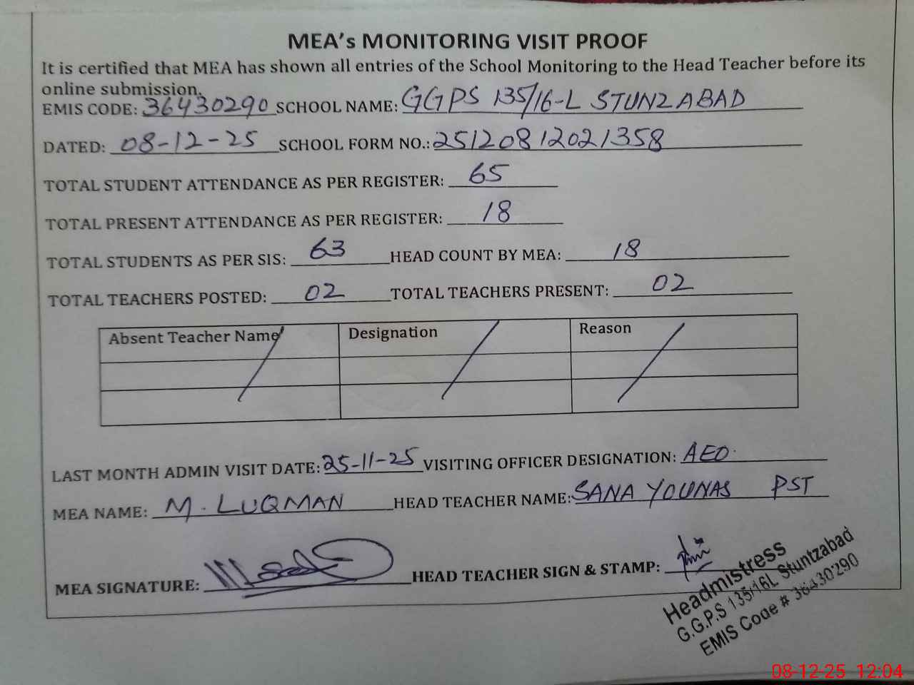 | Attendance Register | Head Teacher | MEA with School | Visit Proof |