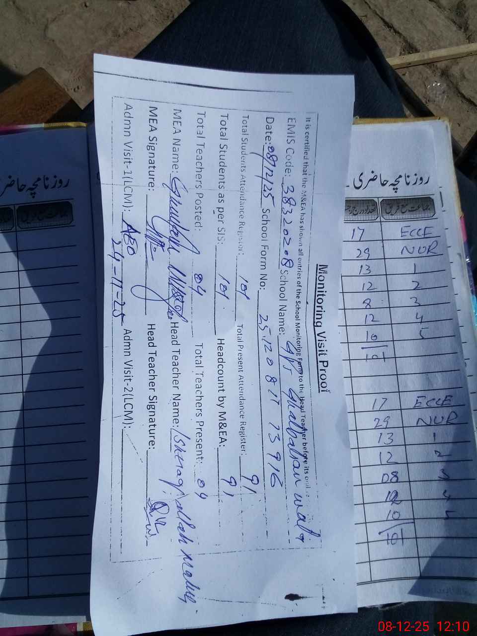 | Attendance Register | Head Teacher | MEA with School | Visit Proof |