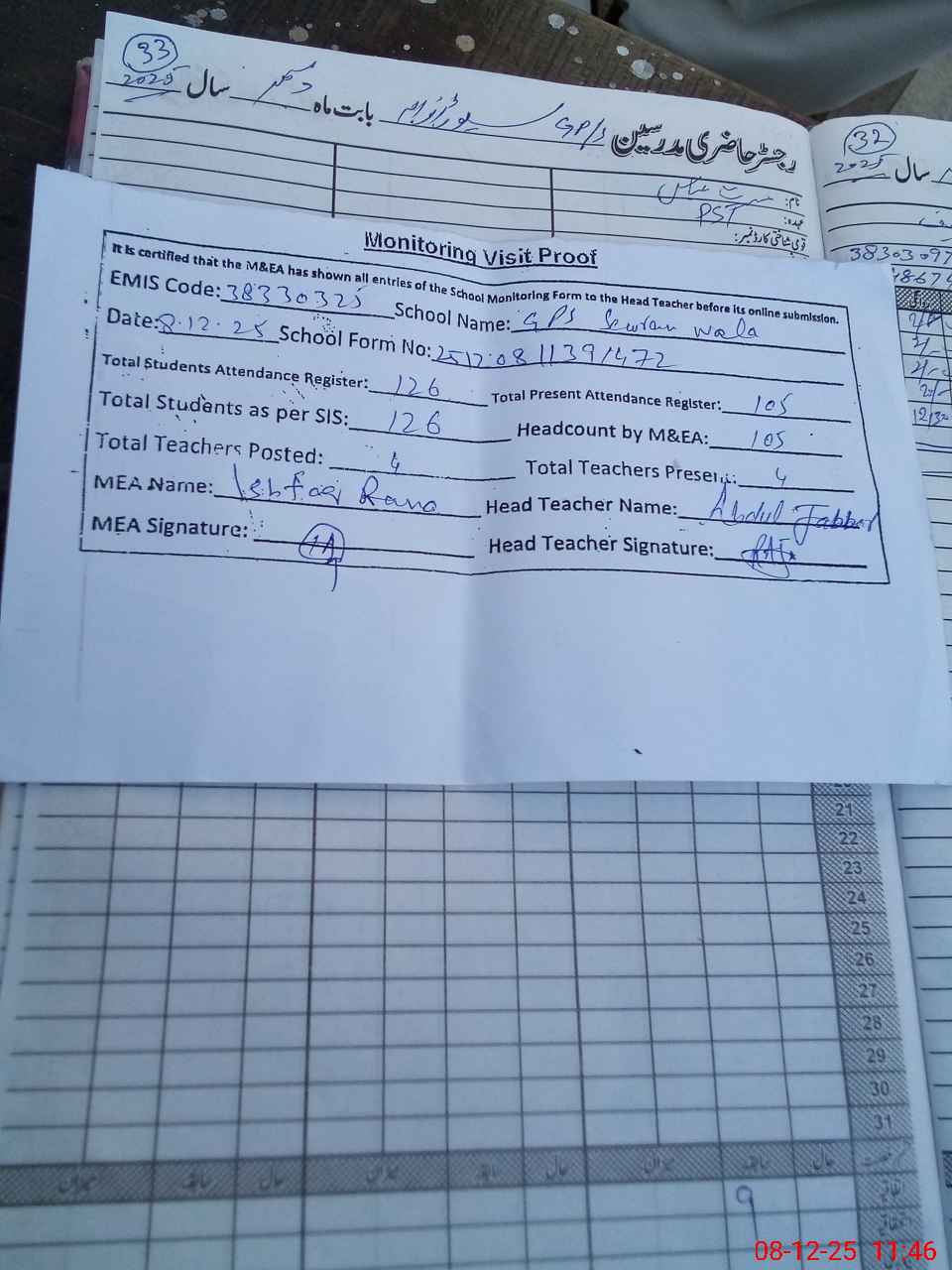 | Attendance Register | Head Teacher | MEA with School | Visit Proof |