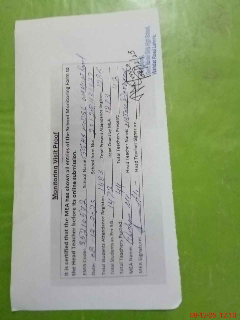 | Attendance Register | Head Teacher | MEA with School | Visit Proof |