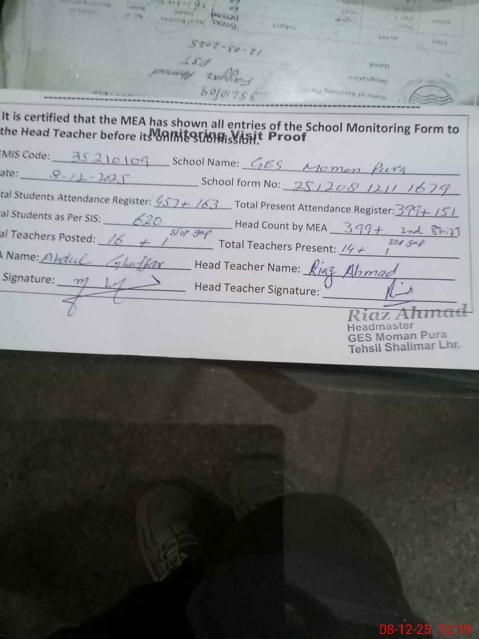 | Attendance Register | Head Teacher | MEA with School | Visit Proof |