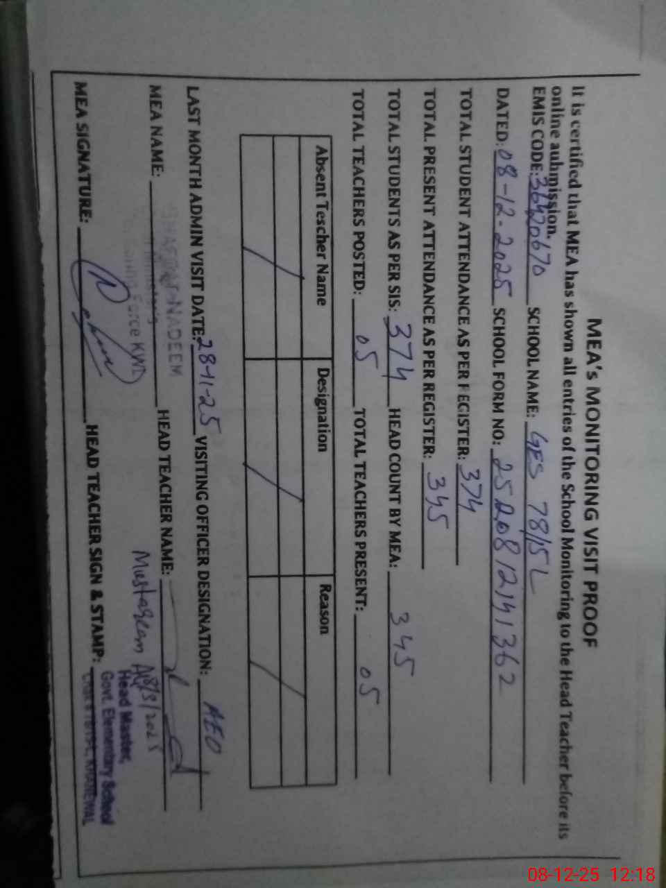 | Attendance Register | Head Teacher | MEA with School | Visit Proof |