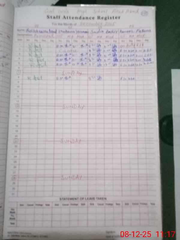 | CNIC | Full Name | Designation | R/C | Absence During Last Calender Month |