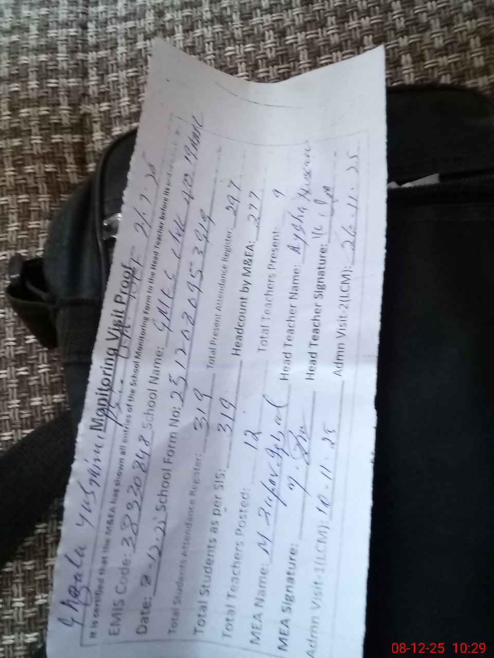 | Attendance Register | Head Teacher | MEA with School | Visit Proof |
