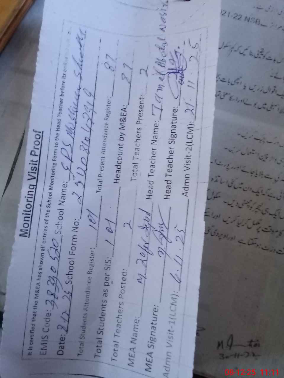 | Attendance Register | Head Teacher | MEA with School | Visit Proof |