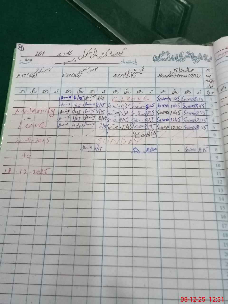 | Leave | Duty | Absent | Maternity | Medical | Ex- Pak |