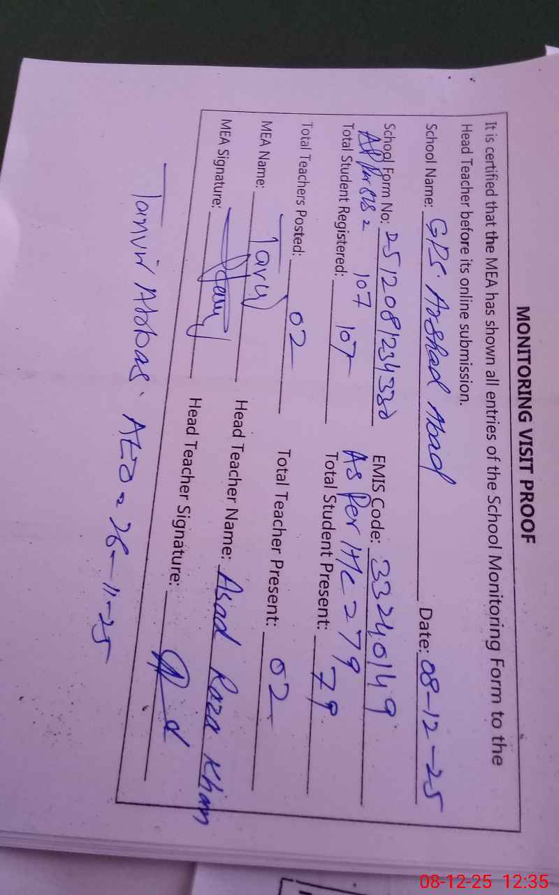 | EMIS Code: 33240149 | Name of School: GPS ARSHAD ABAD DURHI GONDEL | |||
