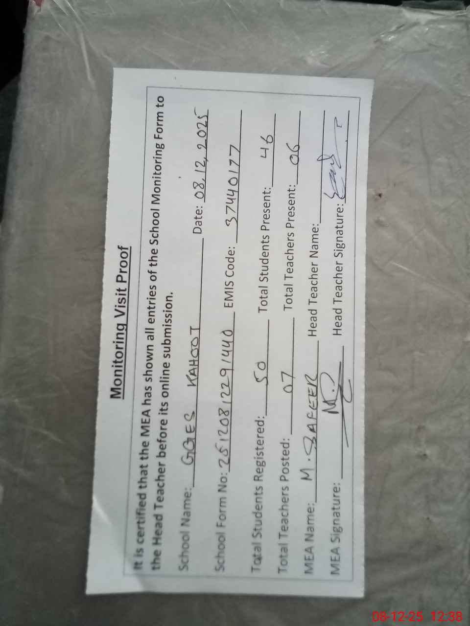 | Attendance Register | Head Teacher | MEA with School | Visit Proof |