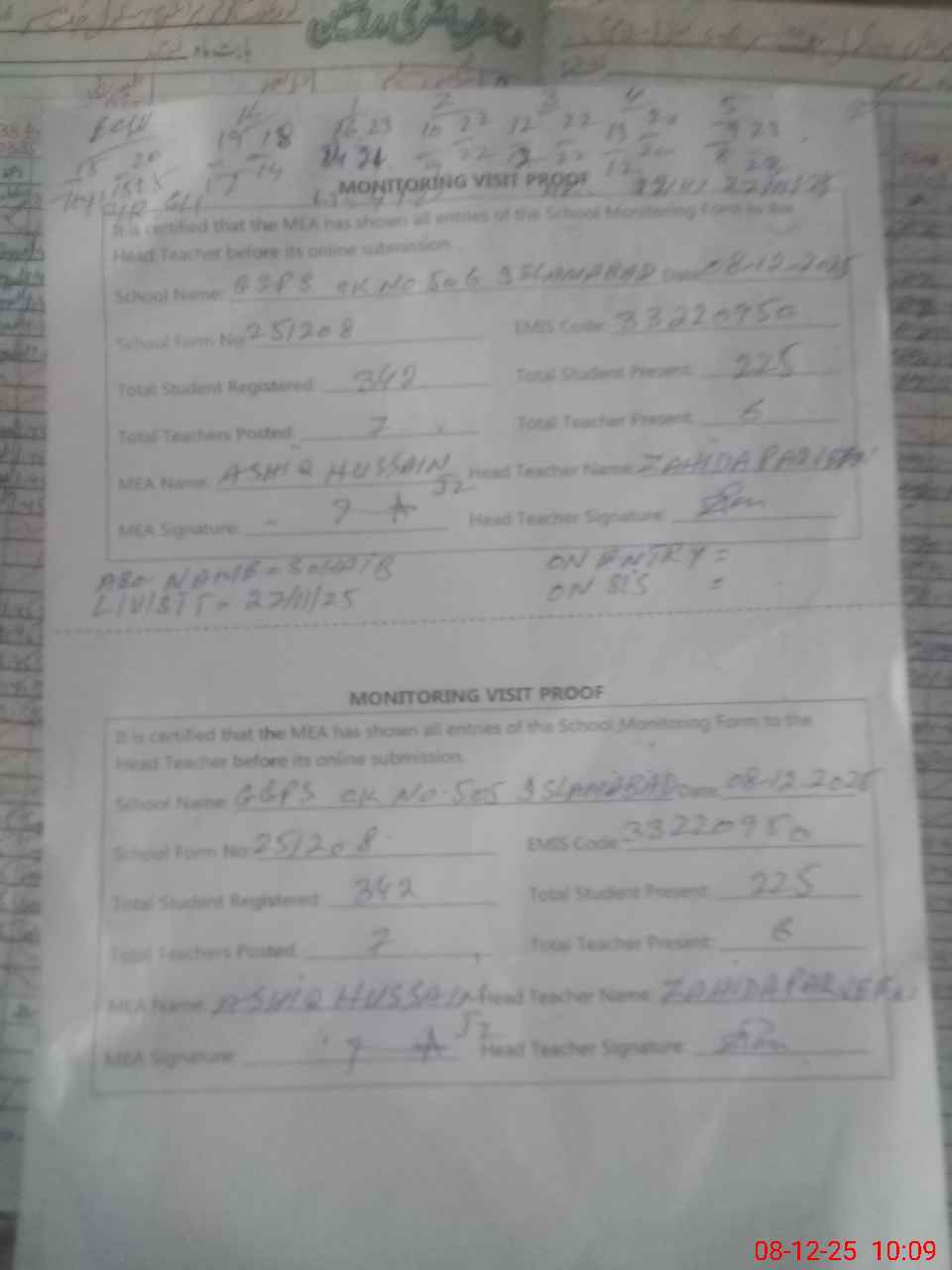 | Attendance Register | Head Teacher | MEA with School | Visit Proof |