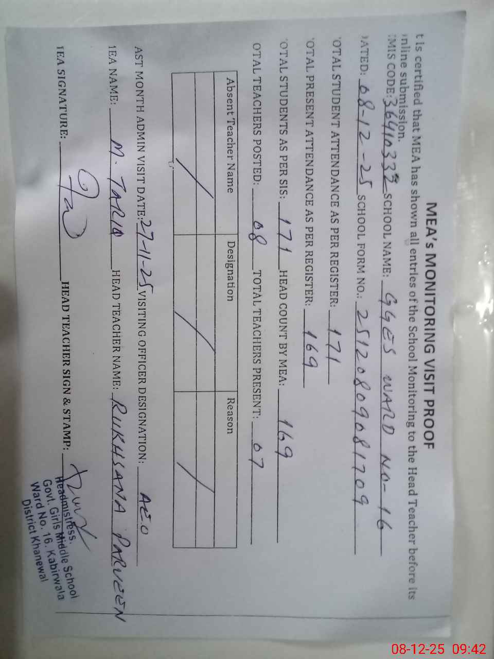 | Attendance Register | Head Teacher | MEA with School | Visit Proof |