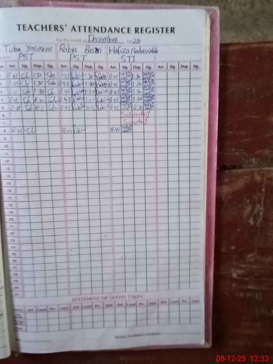 | Leave | Duty | Absent | Maternity | Medical | Ex- Pak |