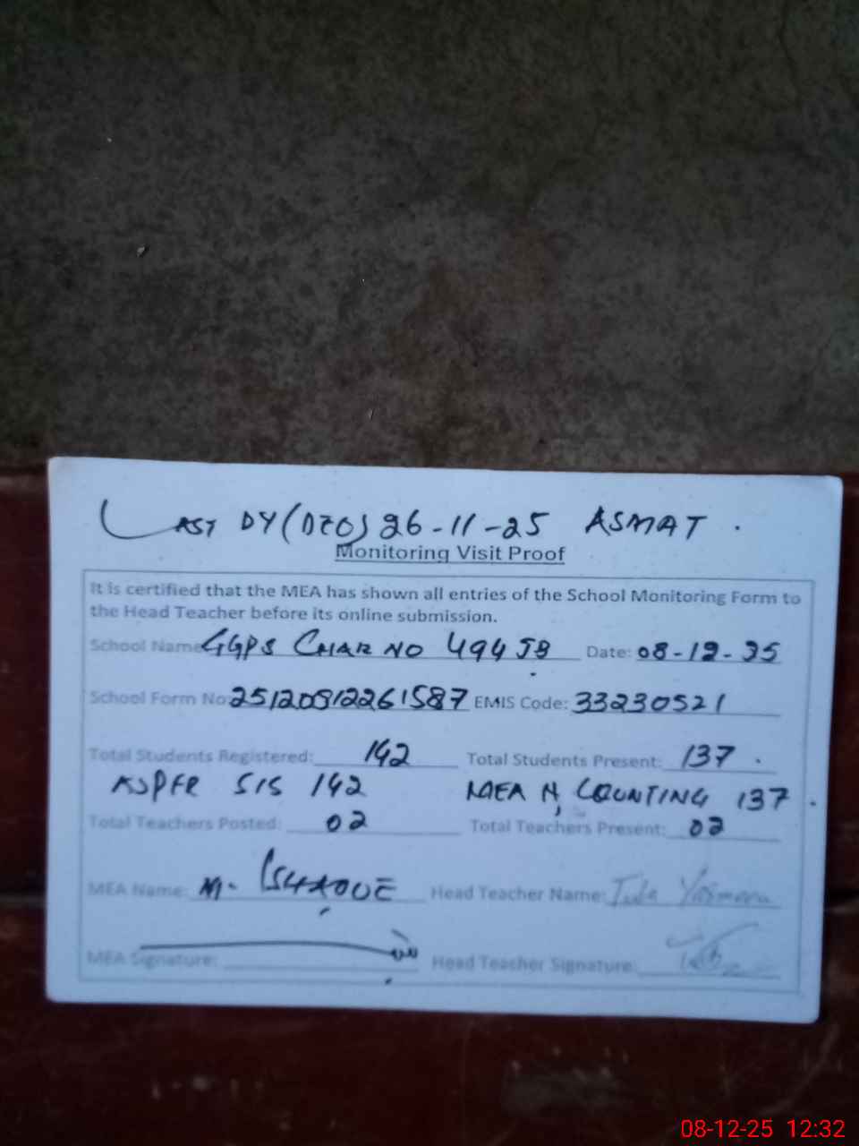| Attendance Register | Head Teacher | MEA with School | Visit Proof |