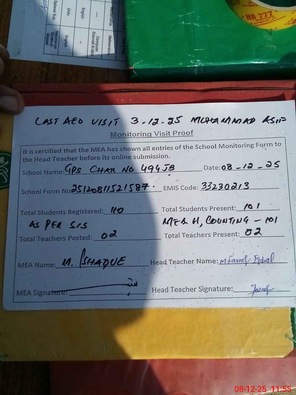 | Attendance Register | Head Teacher | MEA with School | Visit Proof |