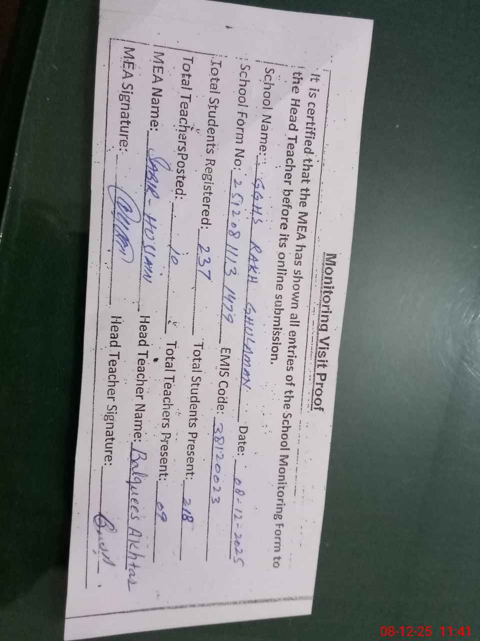 | EMIS Code: 38120023 | Name of School: GGHS RAKH GHULAMAN 22 ML | |||