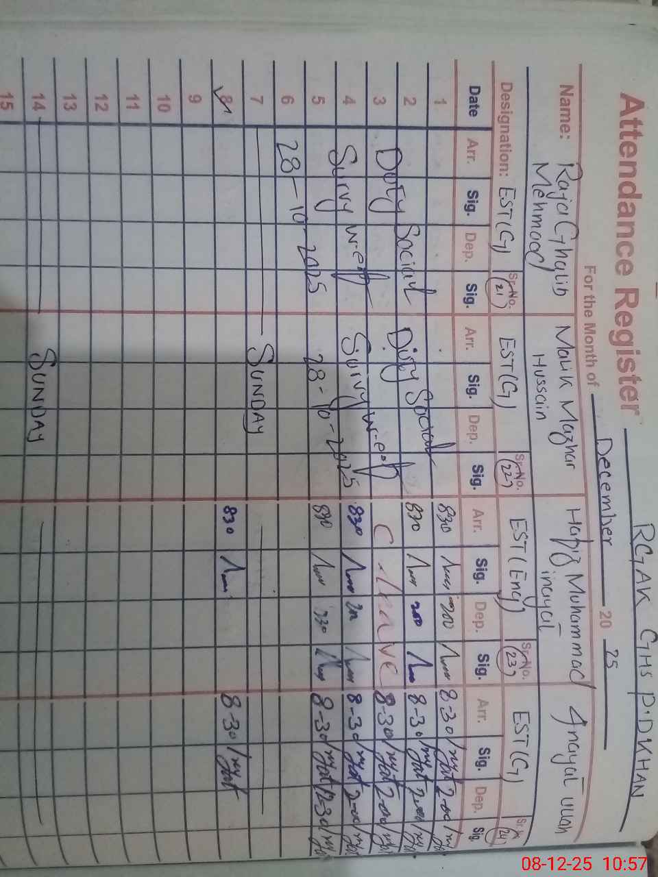 | CNIC | Full Name | Designation | R/C | Absence During Last Calender Month |