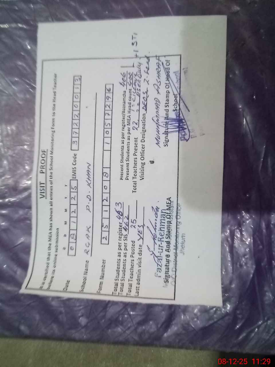 | Attendance Register | Head Teacher | MEA with School | Visit Proof |