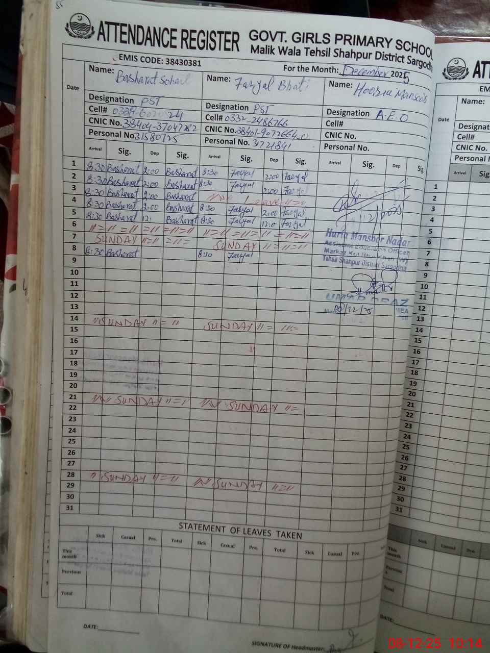 | CNIC | Full Name | Designation | R/C | Absence During Last Calender Month |