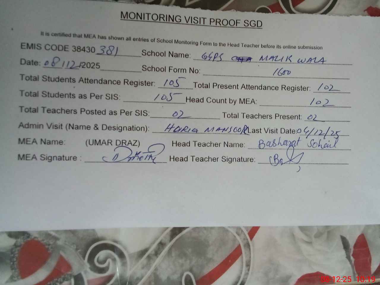| EMIS Code: 38430381 | Name of School: GGPS MALIK WALA | |||