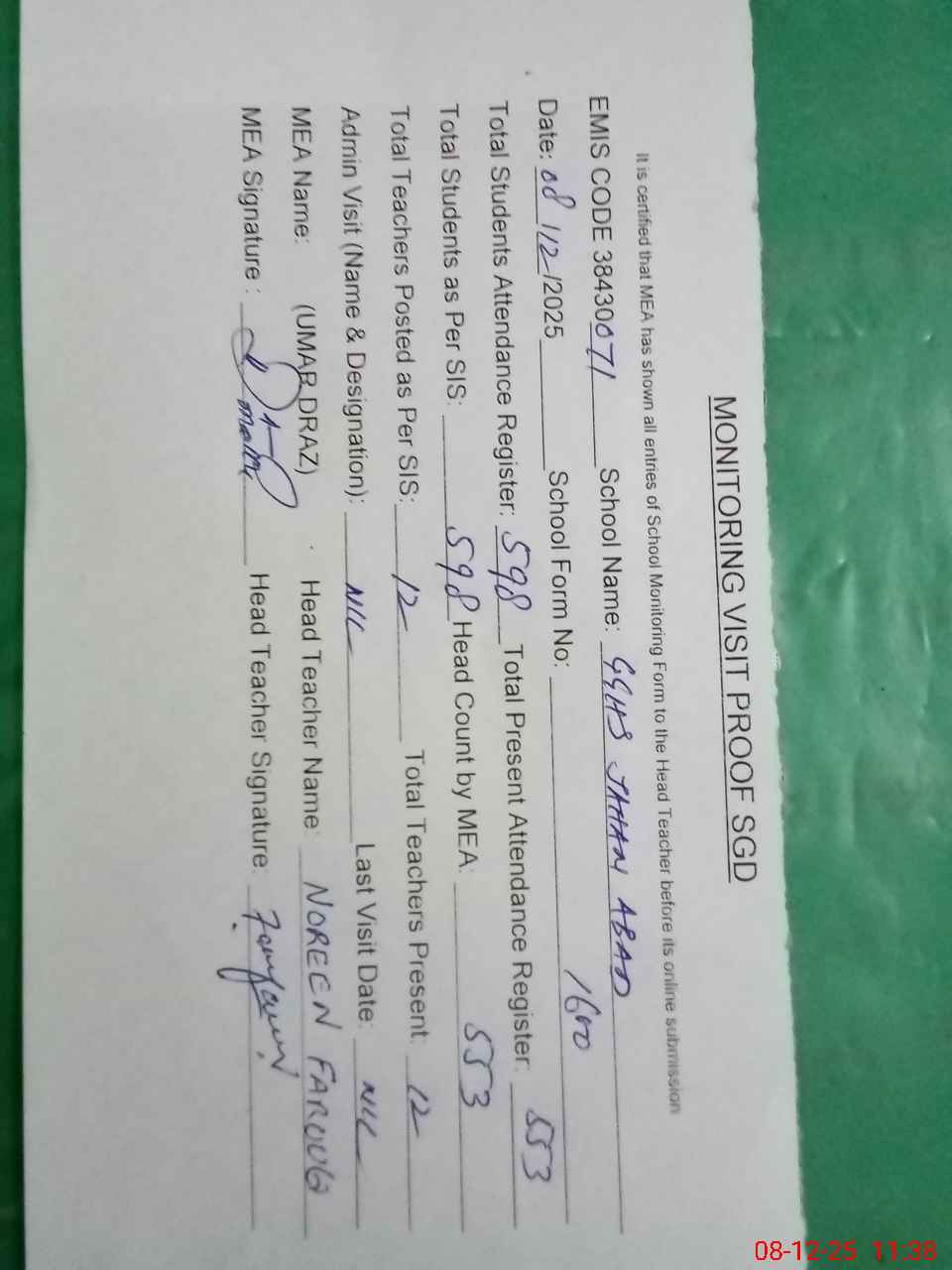 | Attendance Register | Head Teacher | MEA with School | Visit Proof |