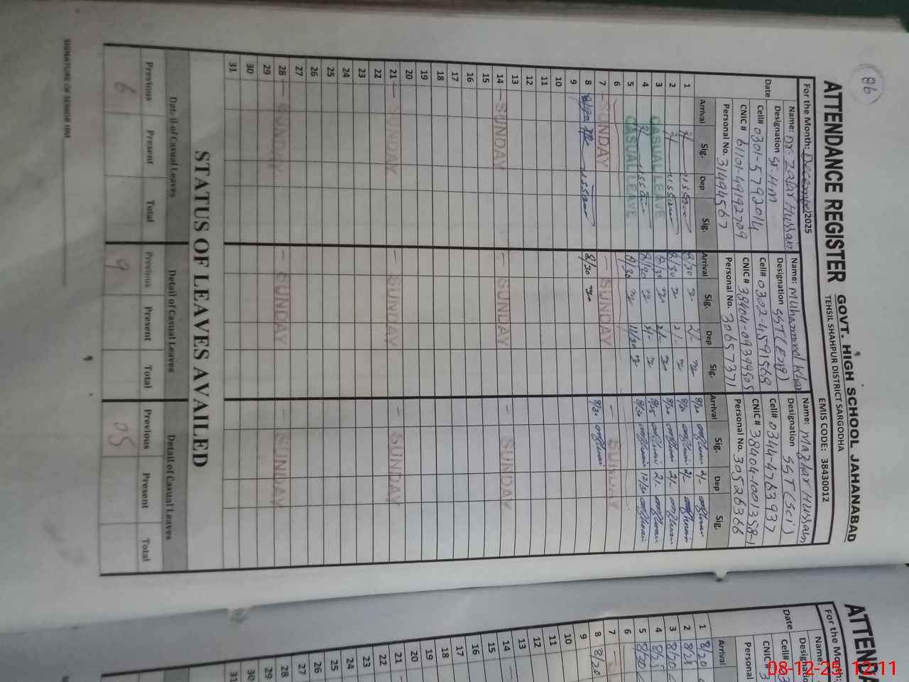 | CNIC | Full Name | Designation | R/C | Absence during last cal. month |