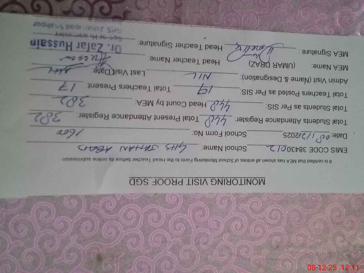 | Attendance Register | Head Teacher | MEA with School | Visit Proof |