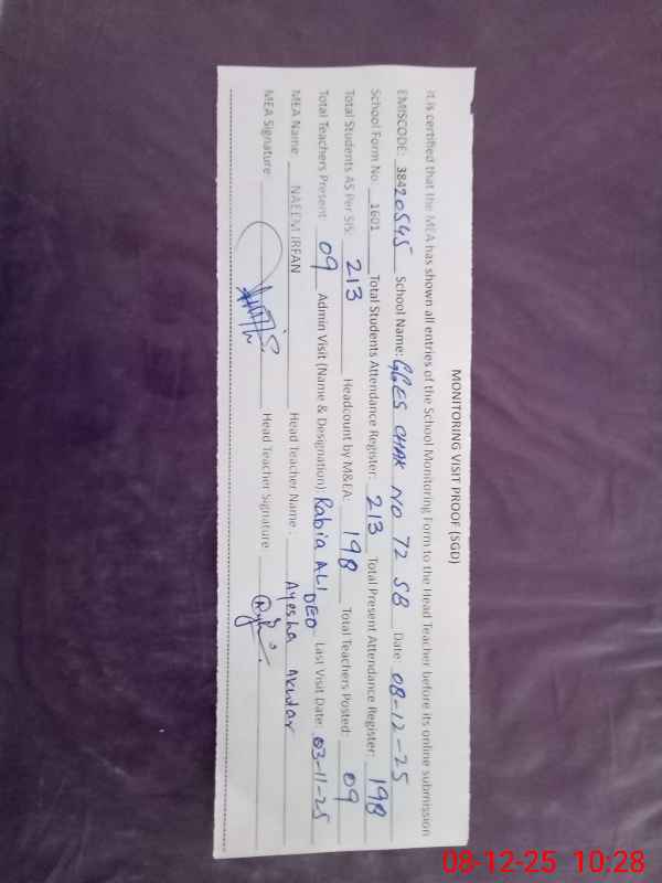 | EMIS Code: 38420545 | Name of School: GGES CHAK NO.72 SB | |||