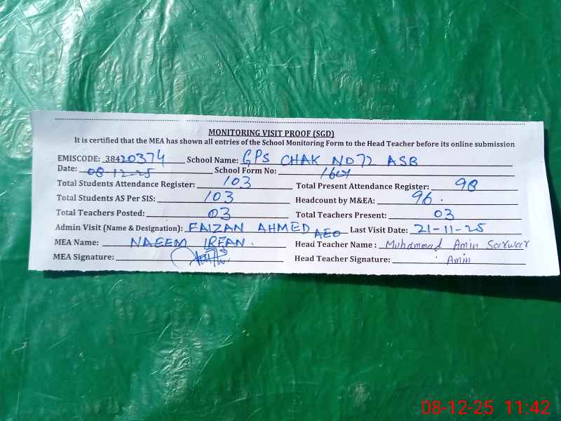 | EMIS Code: 38420374 | Name of School: GPS CHAK NO.72 A-SB | |||